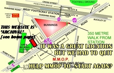 Why did we move, and why is the collection still in jeopardy? Read this 2002 document. Public Transport from Melbourne City:Take a SUNBURY (or SYDENHAM) TRAIN from any city station to West Footscray: travel time 12 min, walk 5 to 7 min. At West Footscray Station, be sure to turn to the right at the top of the ramp (on the bridge). If you reach the Western Bulldogs football oval you have turned the wrong way. The large road-bridge that goes over the tracks is Geelong ROAD. Walk alongside it, do not cross it. The Museum is on the same side as the station. Cross Geelong STREET at the signals. There is a car yard, an "iron foundry" then MMOP. Bus Services in Western MelbourneThere were three bus routes that stopped near ex-MMOP. Route 411 and 412 connect from the Laverton and Nth Altona areas and stop at Robbs Road (near the "Cafe" shown on our map). In the other direction, they connect from Footscray Bus interchange (Paisley St) and stop near Wales St, approximately opposite MMOP. Route 472 connects from Williamstown, Newport, Yarraville areas and stops on Geelong Road, near West Footscray Station. In the other direction it connects from Moonee Ponds, Ascot Vale, Flemington, Nth Footscray areas, via Footscray centre, to a stop near West Footscray Station. Car TravelThe Museum was located in Geelong Road, about 300 m past the 'hump bridge' that crosses the railway at West Footscray. It was located in the inbound service road. (Coming from the city) you pass by the Museum (on your right) and make a U-turn where the sign says 'Robbs Road and Graingers Road'. Go right across into the service road and drive back up Geelong Road. All-day parking is usually available in Robbs Road or Graingers Road but not much in front of the Museum. Consider public transport. Postal address: P.O. Box 555, West Footscray, Victoria, Australia 3012
