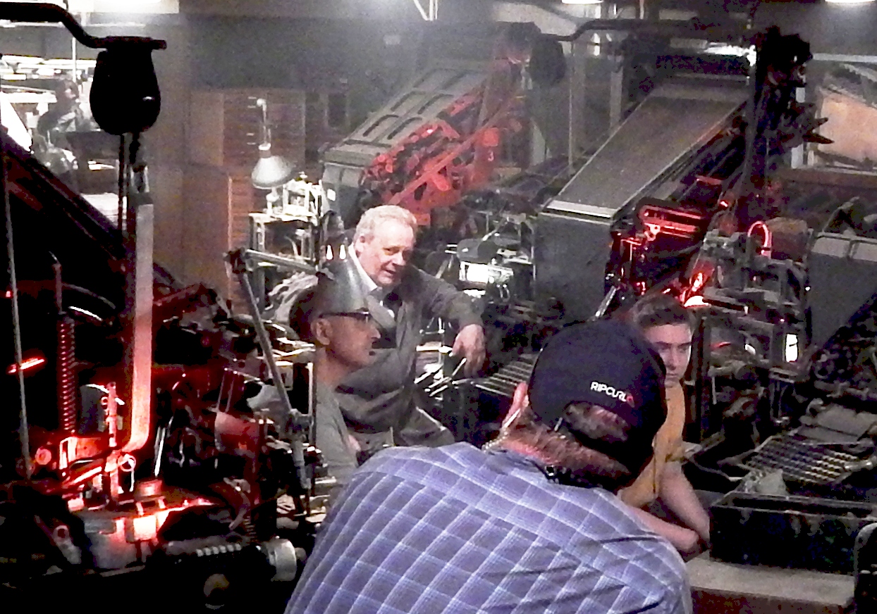 The Linotype Machine produces solid lines ("slugs") of metal type in response to typing on the keyboard. A major comp room could have up to 100 of these line-casters. This MMOP re-enactment had six. There were further machines if needed. Where and when it can be done, the Museum aims to present the "look and feel" of the printing workplace. In typical printing works there would be areas where multiple machines or workstands are set up: several typesetting cabinets, Linotypes, presses and other machines, storage racks, make-up benches. At MMOP we had areas like this set up in a realistic manner: this will be recreated when the Museum is rebuilt. This Linotype area was featured on one of our cards. In this image, a film crew is "shooting" a dramatic scene set in a newspaper office for ABC TV. |