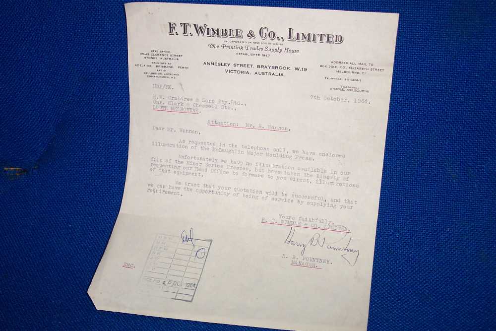 This letter came to the Museum from the records of Crabtree and Sons, successors to Bell and Valentine of South Melbourne. The Museum's B&V collection includes a quantity of reports, catalogs, photographs and other documents which record the workings of a very important manufacturer and exporter of printing machinery.
