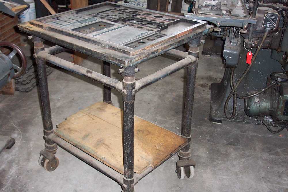 The page trolley is like a stone, but on wheels. A stone is a (usually) cast iron work table needed for making up pages of type. The flat, unbending surface ensures that the page, locked up in its chase, is truly flat.