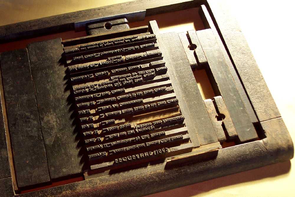 This typesetting, untypically, is preserved in a chase, the frame into which type is placed and locked prior to printing.