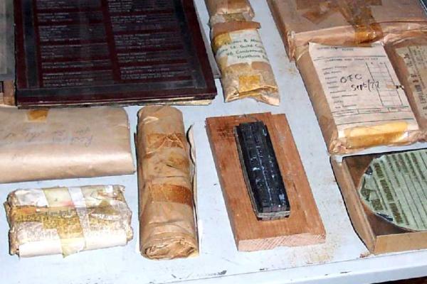 One of the settings has been unwrapped and placed onto a plinth of wood for inspection. Also visible in this picture is a rubber stamp matrix, the dark coloured sheet with the impression of type in it. And a photopolymer plate mounted type-high (front right). Further details on these are in other documents.