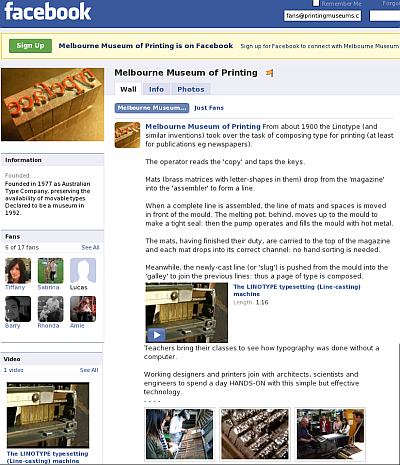 Australia's working and teaching museum of typography and printing located at Footscray, Victoria. Specialising in retention of letterpress, both the equipment and the knowledge - but not ignoring recent developments in printing, many of which are already history.